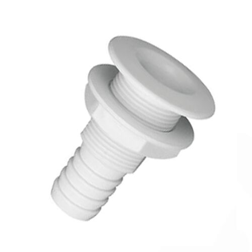 GS Products supply 1" through hull deck drainage socket made with white PVC. It comes with a hose connector and is UV resistant.