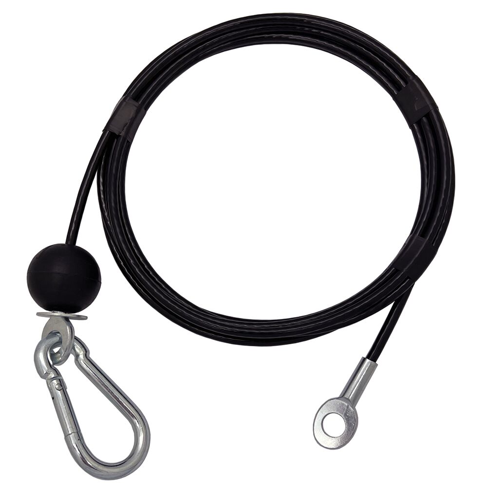 This gym cable is custom made using 4mm - 5.2mm overall diameter nylon coated galvanised wire rope. It has 2 x swage eyes which have 11.2 diameter clearance. One end is fitted with a rubber shock ball and this cable has a 1120kg breaking load limit