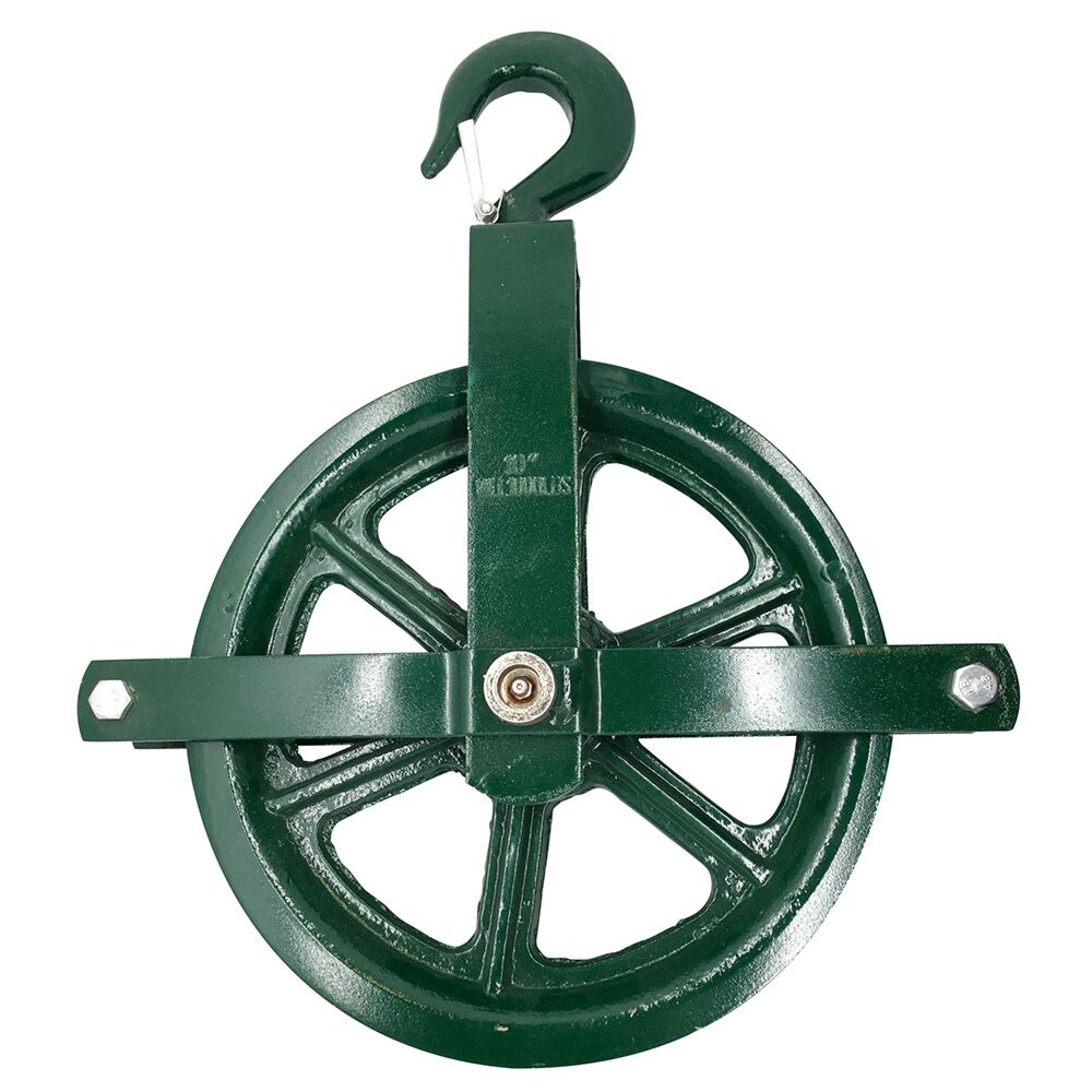 This manually operated gin wheel has a 10" diameter wheel and is commonly used in scaffolding and roofing industries to manually lift lightweight products